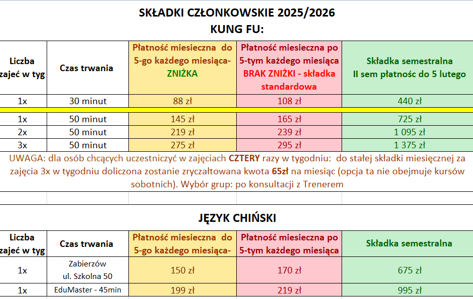 ZAJĘCIA: zajęcia grupowe (przedszkola, szkoły, grupy popołudniowe)- WSZYSTKIE SEKCJE: tabela składek członkowskich poniżej: